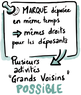 Plus d'une année passe. Le 19 février 2019, je me reveille avec une impulsion de déposer la marque « Les Grands Voisins ». Il n'il y a avait jamais eu de discussion avec qui que ce soit sur le sujet de la marque Les Grands Voisins. Je n'y ai pas pensé la veille, de même le jour après avoir déposé la marque. Trois mois plus tard, je reçois la confirmation de l'INPI et je vérifie si une autre personne ne l'aurait pas déposée entretemps. Il se trouve que le Consortium a déposé effectivement la même marque (sauf avec un logo) en collectif le même jour que moi. Un employé de l'INPI me déclare que dans ces 42 ans à l'INPI, il n'a jamais vu ce cas. Nous avons tous les deux – le Consortium et moi-même – les mêmes droits dans un régime de simultanéité de la marque (régime jusqu'à une réforme de décembre 2019). Moi et le Consortium sont voisins.