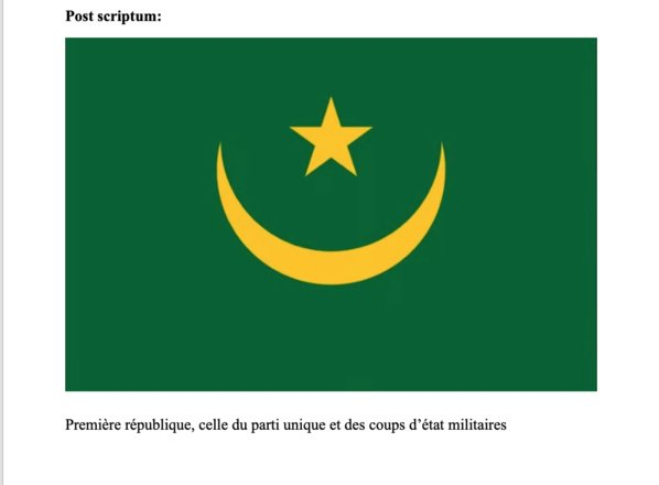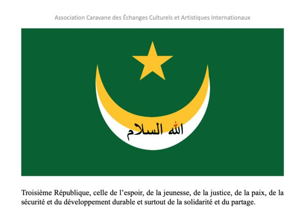 Je vous prie de faire un referendum pour le drapeau de la 3e République et demande à tous ceux qui liront cette lettre ouverte et qui se retrouvent dans l’esthétique divine de ce nouveau drapeau de bien vouloir me faire un retour. Ce drapeau représente un croissant blanc tel un linceul en hommage à tous nos mort fussent-ils martyrs ou résistants entre autres. Et Salam le 6e nom d’Allah avec son accent rouge qui symbolise cette goutte de sang si métissé qui coule dans nos veines ainsi renforçant notre fraternité, notre solidarité et notre parenté.